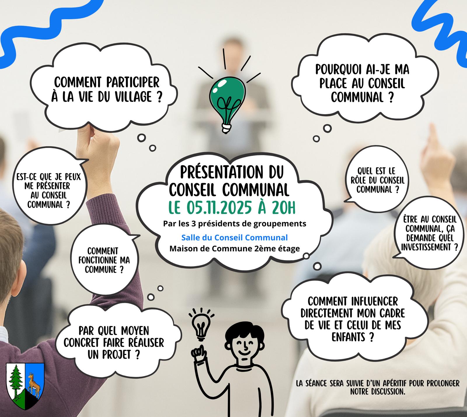 Le 5 novembre 2025, les présidents des 3 groupements de Roche s'unissent pour vous présenter le rôle et le fonctionnement du Conseil Communal. Si vous avez envie de découvrir cela, sans vous engager, n'hésitez pas à participer à cette rencontre!